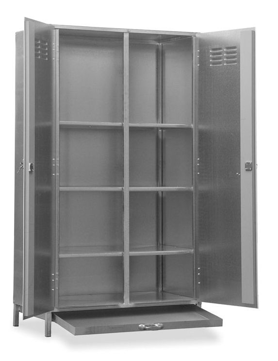 Los armarios están fabricados con esqueleto de tubo de acero galvanizado calidad S-275-JR.Estantes, forro, bandeja y puertas fabricadas en chapa de acero galvanizado calidad S-275-JR de 1 mm de espesor. Herrajes y componentes en diferentes acabados: niquel, cromo y zinc. Como sistema de protección del usuario dentro del entorno laboral, se dota a las puertas de los armarios de un protector polimérico situado a lo largo de todo el filo de cada hoja.